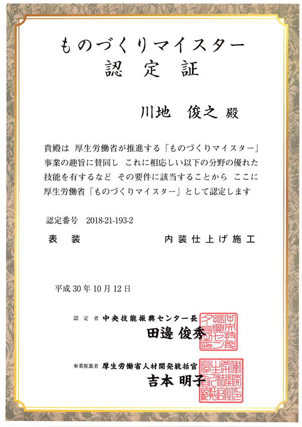 川地装飾の代表、川地俊之です。昭和61年に創業してから約40年、ひたすら内装工事に命を懸けてまいりました。